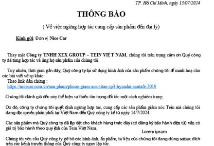 Thông báo ngừng hợp tác cung cấp sản phẩm đến đại lý Nice Car